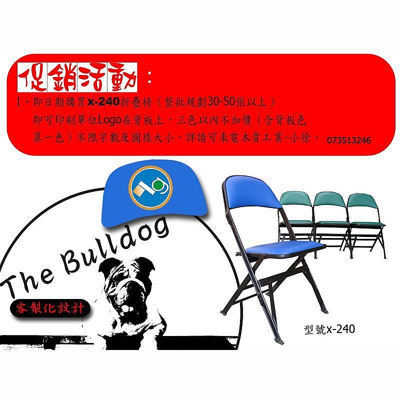 即日期購買 x - 240 折疊椅( 整批規劃 30 - 50 張以上 )即可印刷單位 Logo 在背板上 三色以內不加價(含背板色算一色)不限字數及圖樣大小,詳請可來電木貴工業 - 小徐。
