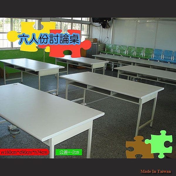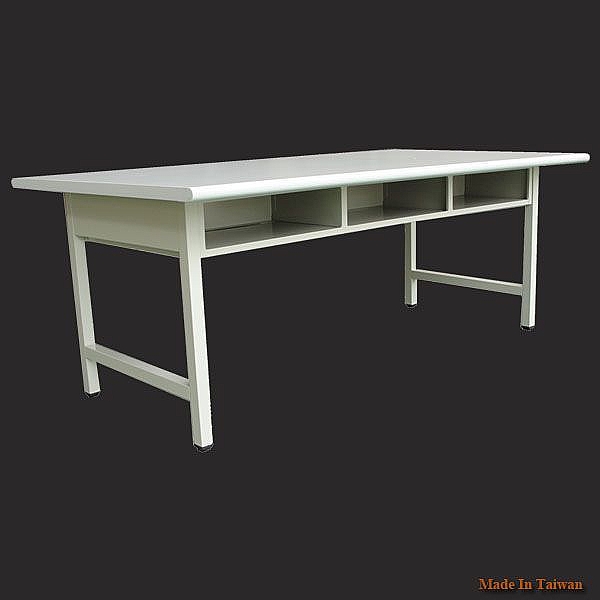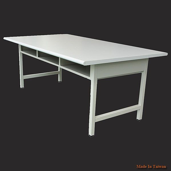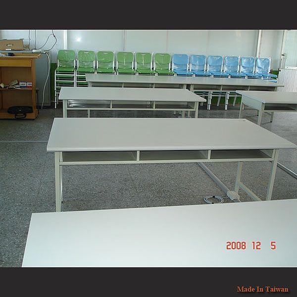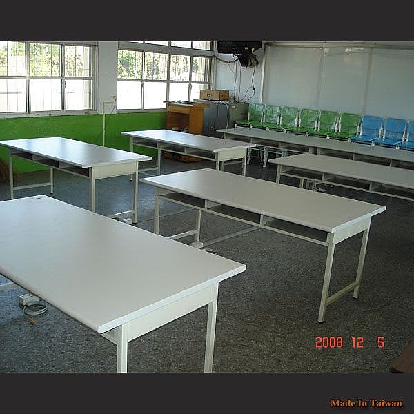 - 桌面由 3cm 木心板面貼 905 灰白色美耐板, 3mm 膠條厚封邊。
