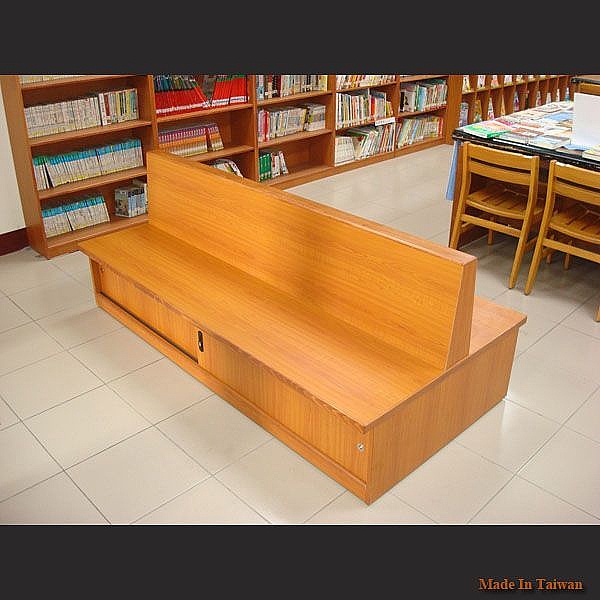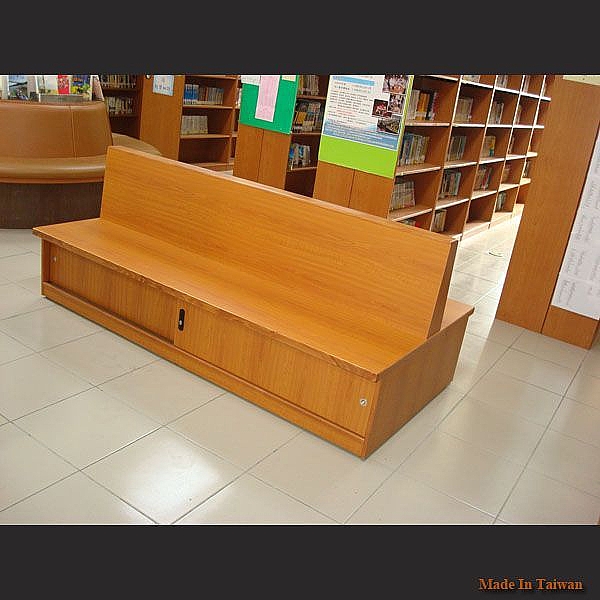 - 主結構:由熱壓木心板 18mm 製成,外貼美耐板,截面 3mm 實木封邊。包含靠背板部分、坐板部分及藏書空間。本書櫃下方兩側處備有藏書空間。可讓使用者坐於兩側上方閱讀刊物。